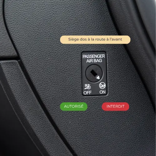 Lorsqu’un siège est placé à l’avant du véhicule, il doit être orienté dos à la route et l’airbag passager doit impérativement être désactivé. Un témoin lumineux sur le tableau de bord confirme cette désactivation.